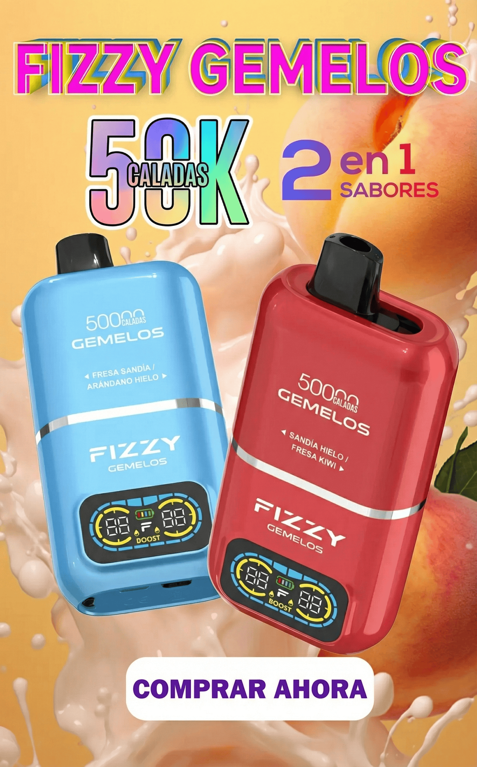 Un modelo definitivo de gran capacidad que permite disfrutar de 6 sabores en un solo dispositivo. Máxima variedad y larga duración.**Fizzy Twins (50.000 caladas):**